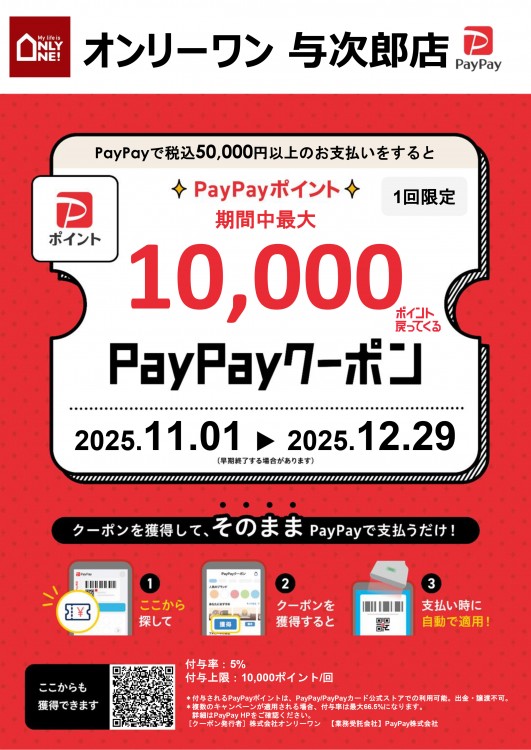 11月1日より、与次郎店にてPayPayクーポン配信スタート✨対象のクーポンを獲得していただくと、50,000円以上のPayPayでのお支払いで最大10,000ポイント(5%)付与いたします!!