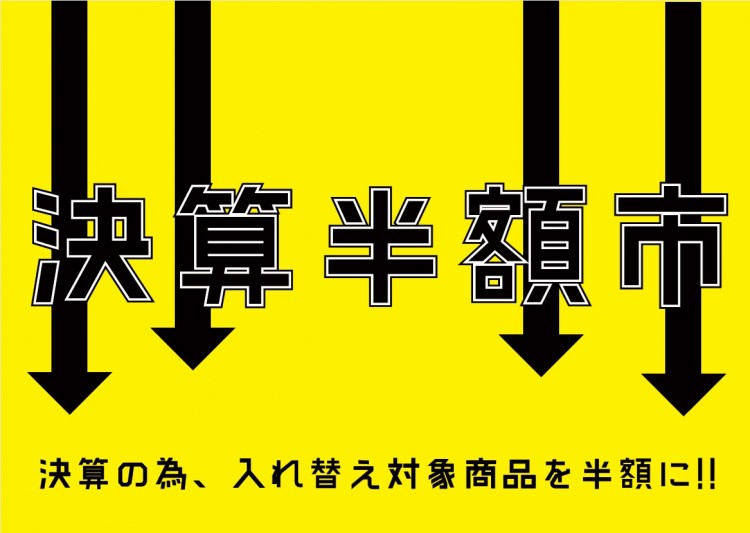 日頃のご愛顧に感謝を込めまして、3月14日(土)より「決算半額市」を開催いたします!オンリーワンはもうすぐ決算期。そして春の新作や新しいアイテムをお迎えする準備として、展示商品の入れ替えを行います。それに伴い、入れ替え対象となる商品を特設コーナーにて【全品半額(50%OFF)】の特別価格にてご提供いたします!■ 家具も雑貨も対象です!「半額市」特設コーナーに並んでいる商品は、ダイニングチェアなどの家具から、毎日使える生活雑貨まで、すべてが表示価格から50%OFFとなります。お引越しや春の模様替えをご検討中の方には、またとない大チャンスです!■ 特設コーナーの場所2階のエレベーター側の壁際〜隣接スペースにて展開いたします。売り場には、黄色と黒の目を引く「決算半額市」の大きなポスターやPOPを掲示しておりますので、そちらを目印👀にお越しください。<イベント詳細>期間: 2026年3月14日(土) 〜 3月29日(日)場所: 2階 エレベーター側 特設コーナー対象: 特設コーナー内の入れ替え対象商品(全品50%OFF)※対象商品は数に限りがございます。現品限りの商品も多いため、お目当ての商品がございましたら、ぜひお早めにご来店くださいませ。スタッフ一同、皆様のご来店を心よりお待ちしております!
