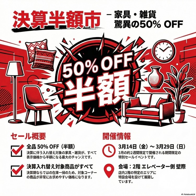 【予告】3月14日(土)スタート!家具も雑貨も全品50%OFF「決算半額市」開催のお知らせ